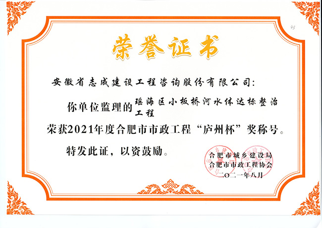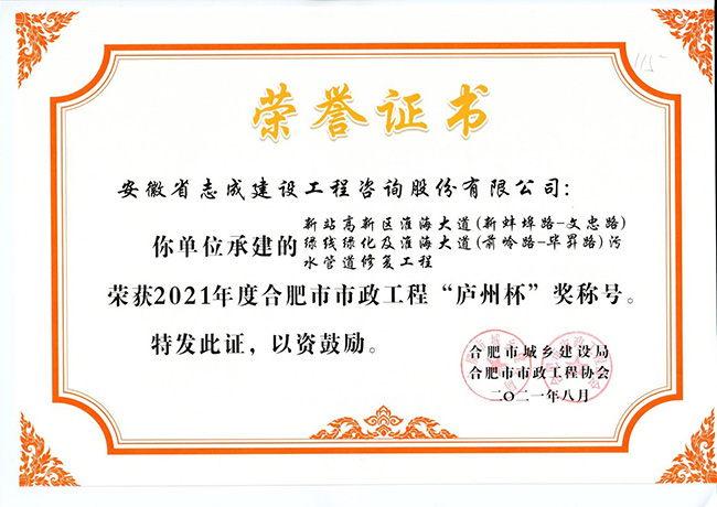 我公司合肥市特殊教育中心北校區工程、政務區祁門路幼兒園及地下車庫工程、合肥煙草工貿總公司易地技改建設項目-聯合工房工程喜獲2021年度合肥市建筑工程“琥珀杯”獎;.瑤海區小板橋河水體達標整治理工程、合肥高新區2019年度第四批綠化工程、分水嶺路(新港路-團肥路)工程、新站高新區淮海大道(新蚌埠路-文忠路)綠線綠化及淮海大道(前嶺路-畢昇路)污水管道修復工程、撮鎮星光大道等四條道路綠化提升工程、安徽居巢經濟開發區投資有限公司S105與S208連接線工程殷家山路、朝陽山路、平頂山工程、肥東縣縣級道路暢通工程(馬湖至石塘)道路綠化工程喜獲2021年度合肥市市政工程“廬州杯”獎。