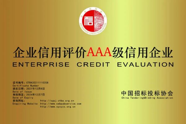 熱烈祝賀我司榮獲中國招標投標協會“AAA級信用企業”